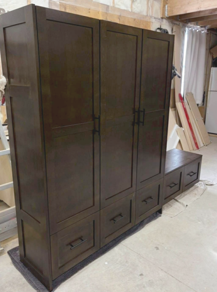 2 step bar, walnut live edge bar top, walnut shelves and farmhouse sink cabinet finished