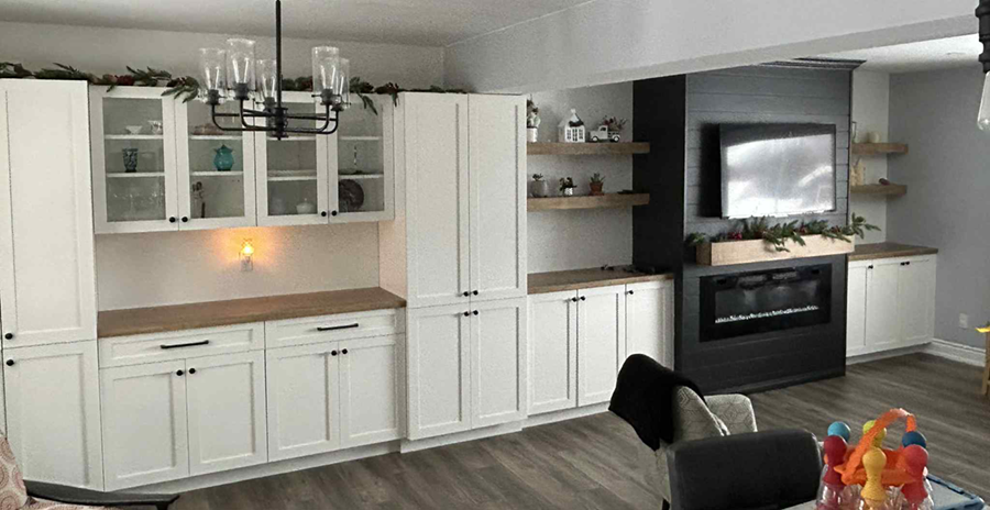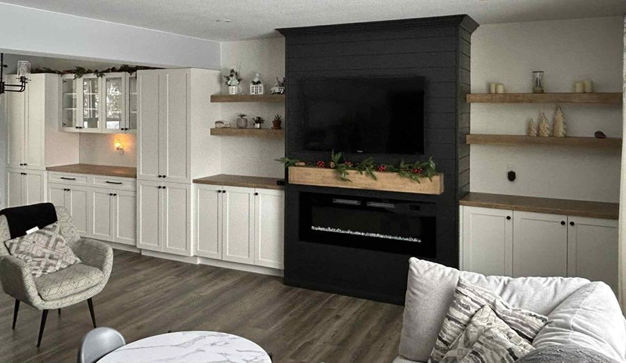 Cabinets, fireplace, floating shelves ...