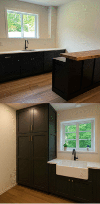 2 step bar, walnut live edge bar top, walnut shelves and farmhouse sink cabinet finished
